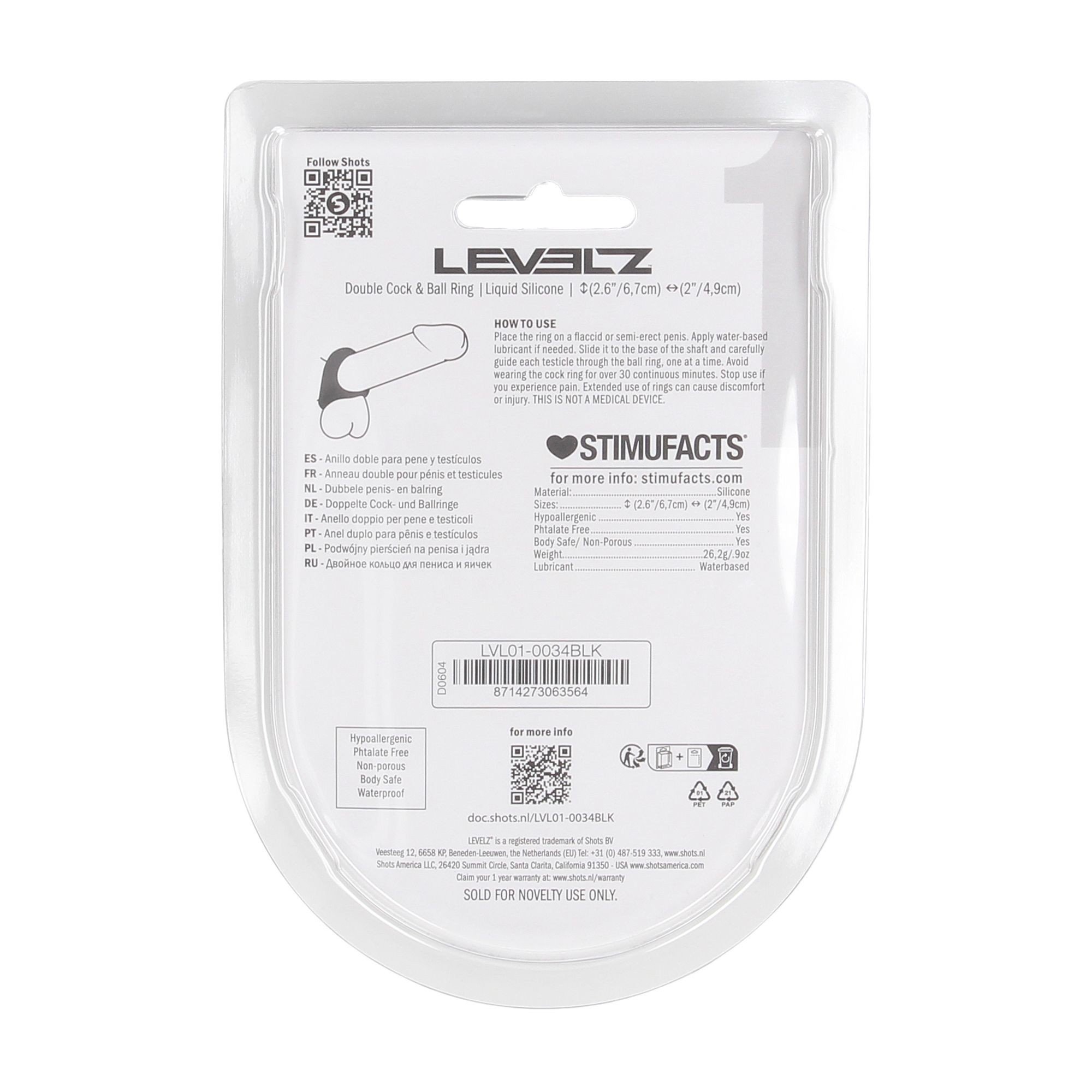 Dvojitý krúžok na penis a semenníky Levelz je navrhnutý tak, aby pohodlne a pevne sedel na penise aj semenníkoch. Je vyrobený z hladkého a pružného tekutého silikónu a poskytuje intenzívnejšie pocity a zlepšuje erekciu.