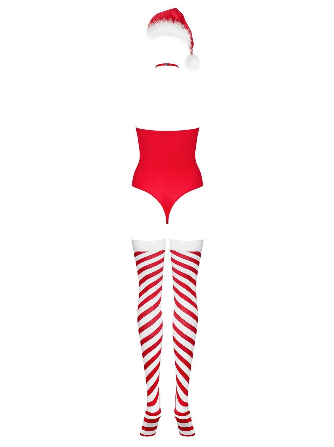 Zmyselný vianočný kostým v červenej farbe. Elastický body s pásikom nad poprsím, ktorý ho drží na mieste, má pripevnený obojok s mašľou. Kostým dopĺňajú ladiace pančucháče a červená vianočná čiapka. Viac informácií