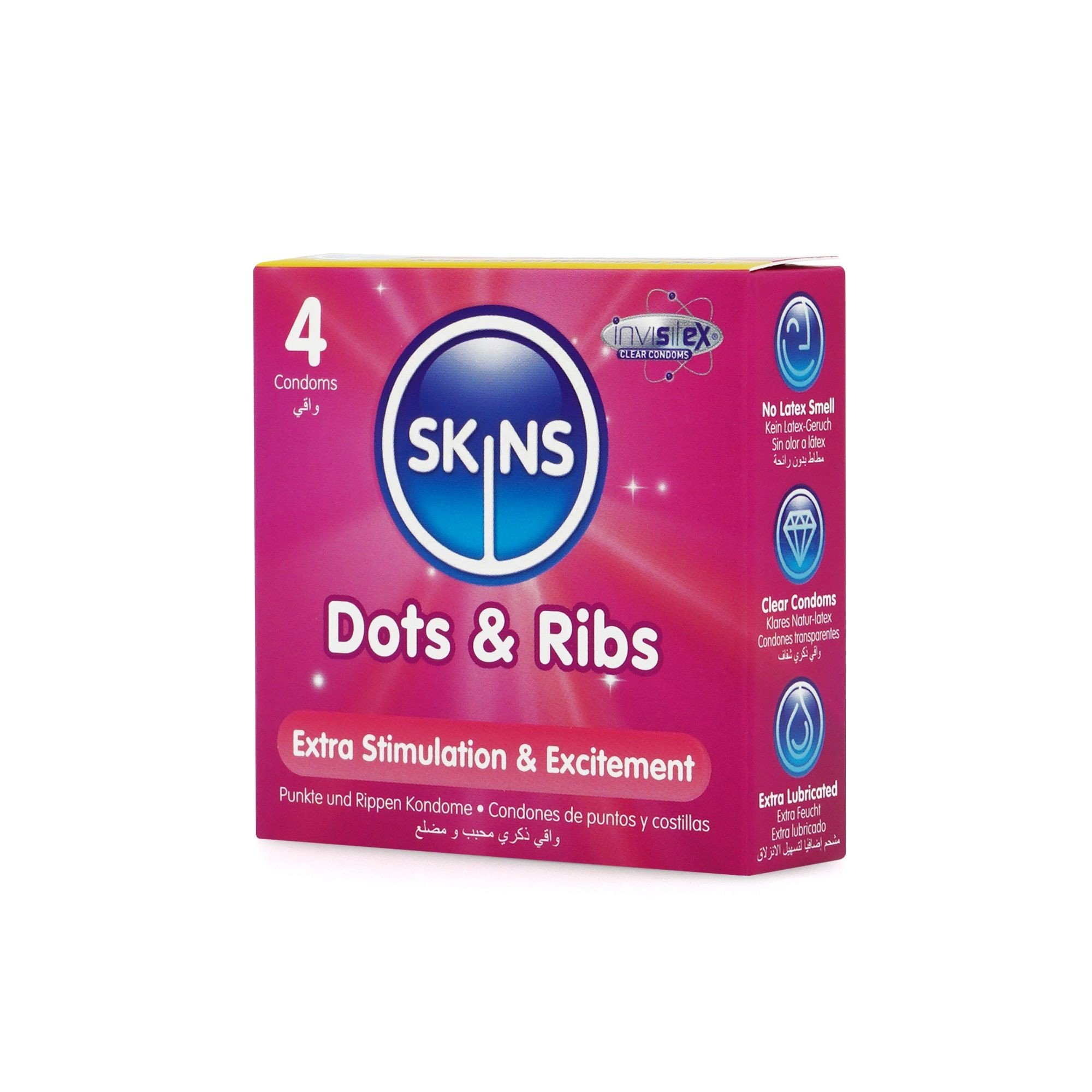 Kondómy Skins Dots & Ribs kombinujú strategicky umiestnené rebrá, ktoré jemne stimulujú používateľa, s malými bodkami pre maximálne potešenie partnera. Sú vyrobené z kvalitného prírodného latexu, sú tenké, ale zároveň odolné a spoľahlivé. Transparentné prevedenie zaisťuje prirodzený vzhľad v porovnaní so štandardnými kondómami, ktoré majú mierne mliečnu farbu.