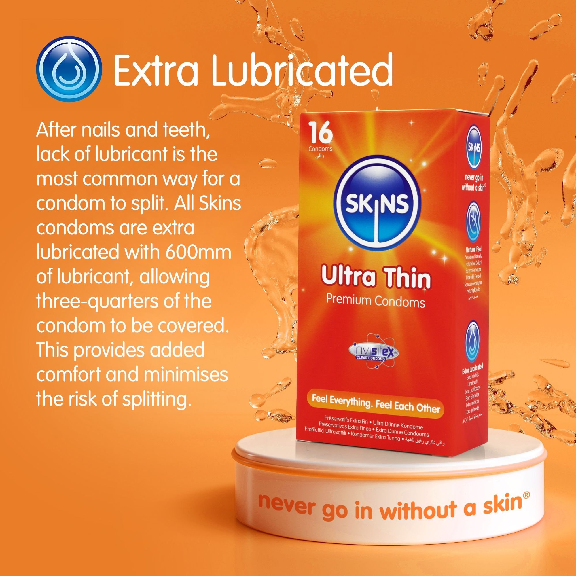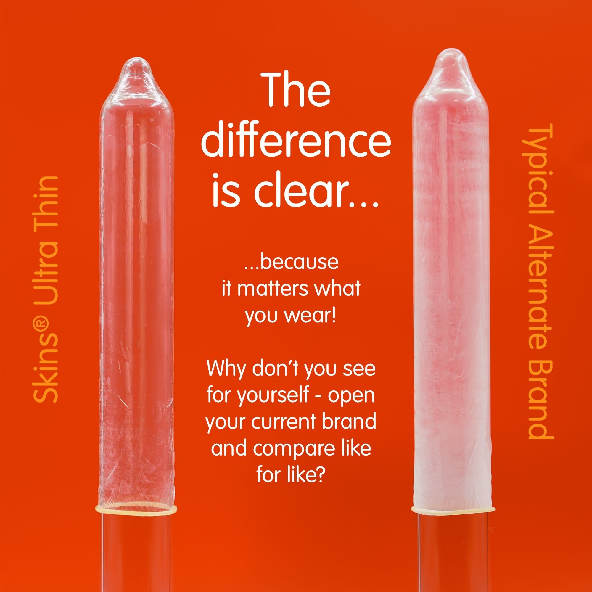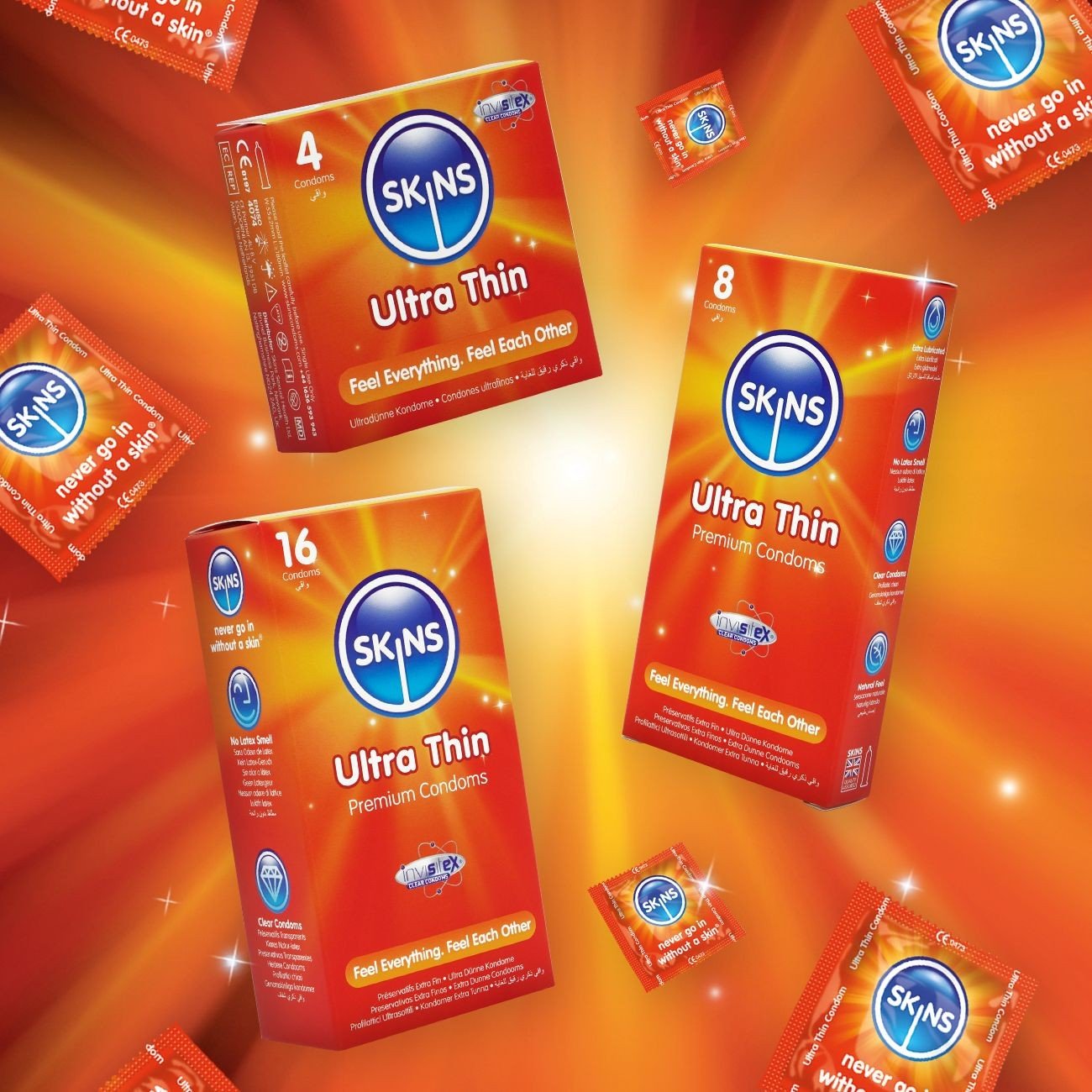 Skins Ultra Thin sú najtenšie kondómy od Skins – tenké, ale odolné a spoľahlivé. Sú vyrobené z kvalitného prírodného latexu a pri nosení pôsobia ako druhá koža. Transparentné prevedenie zaisťuje prirodzený vzhľad v porovnaní so štandardnými kondómami, ktoré majú mierne mliečnu farbu.