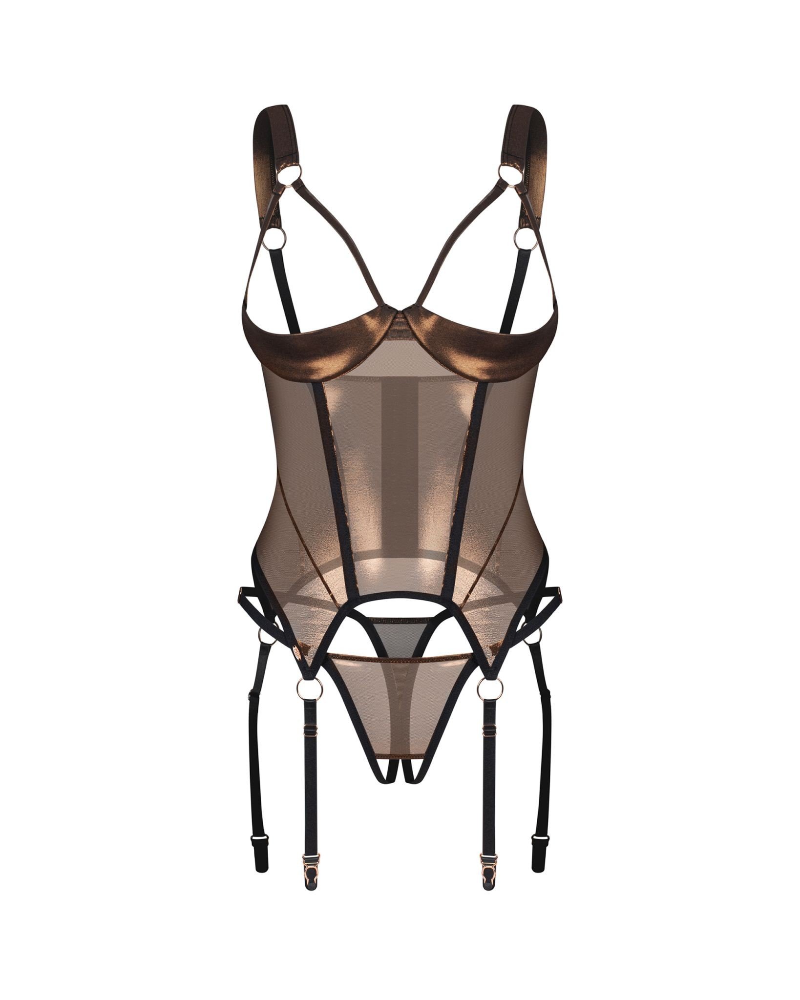 Elegantná zlatá súprava pozostávajúca z priehľadného korzetu s otvorenými košíčkami a tangami bez rozkroku. Korzet vizuálne tvaruje postavu, zdôrazňuje pás a dekolt. Viac informácií
