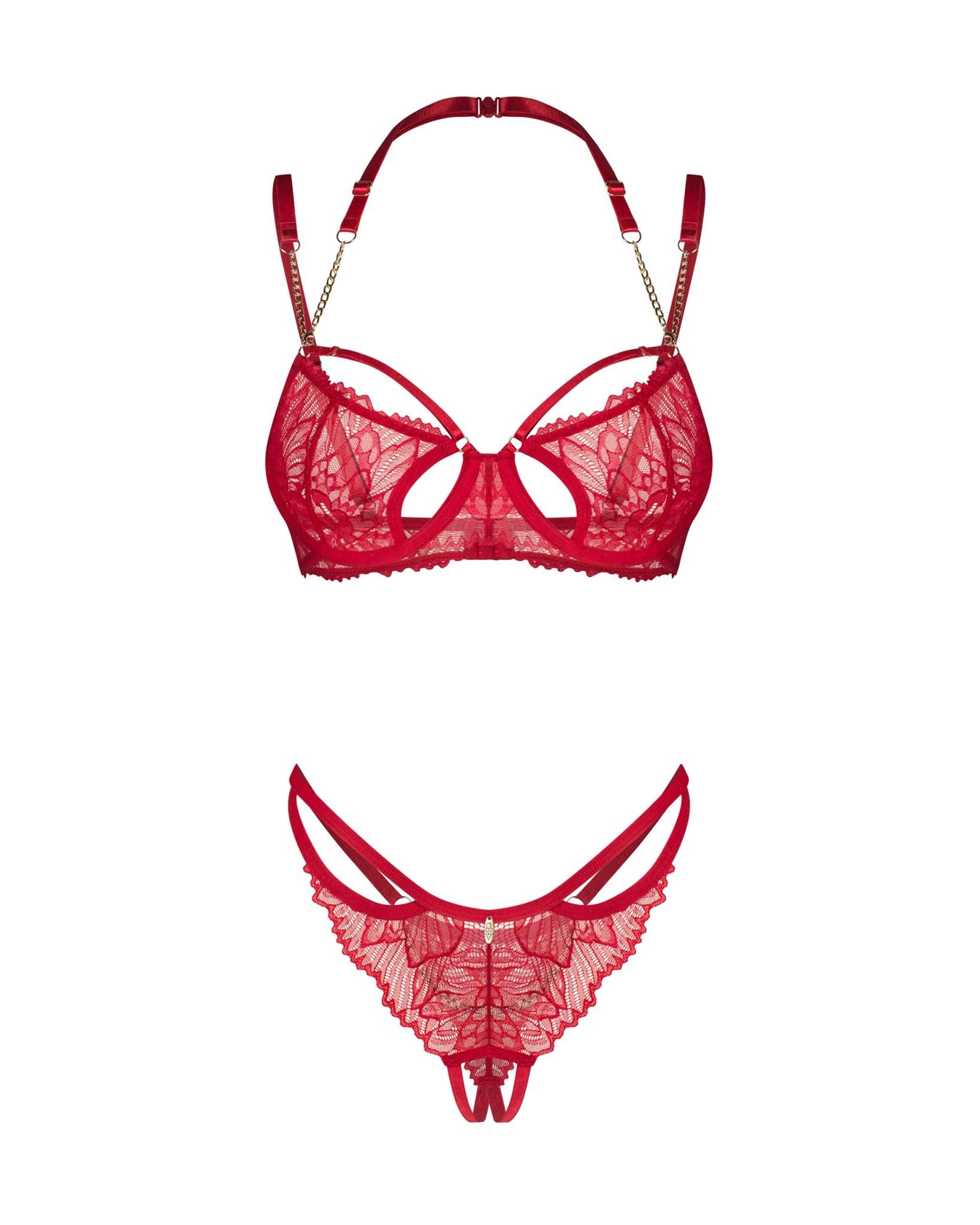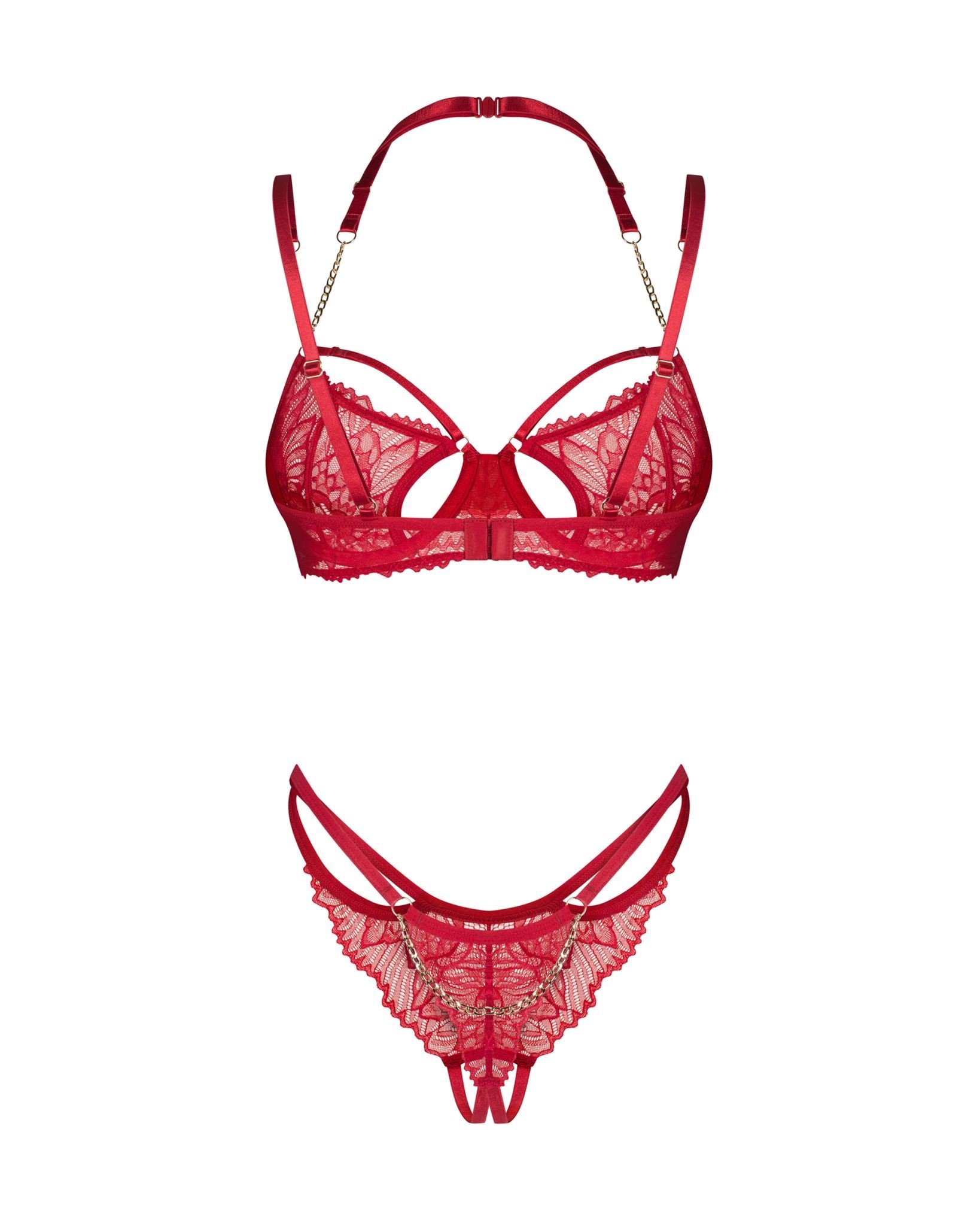 Elegantná červená súprava erotického spodného prádla z kvetinovej čipky. Podprsenka s kosticami má ozdobný ramienok s reťazou okolo krku. Tanga majú otvorený rozkrok a sú zdobené reťazou na zadočku. Viac informácií