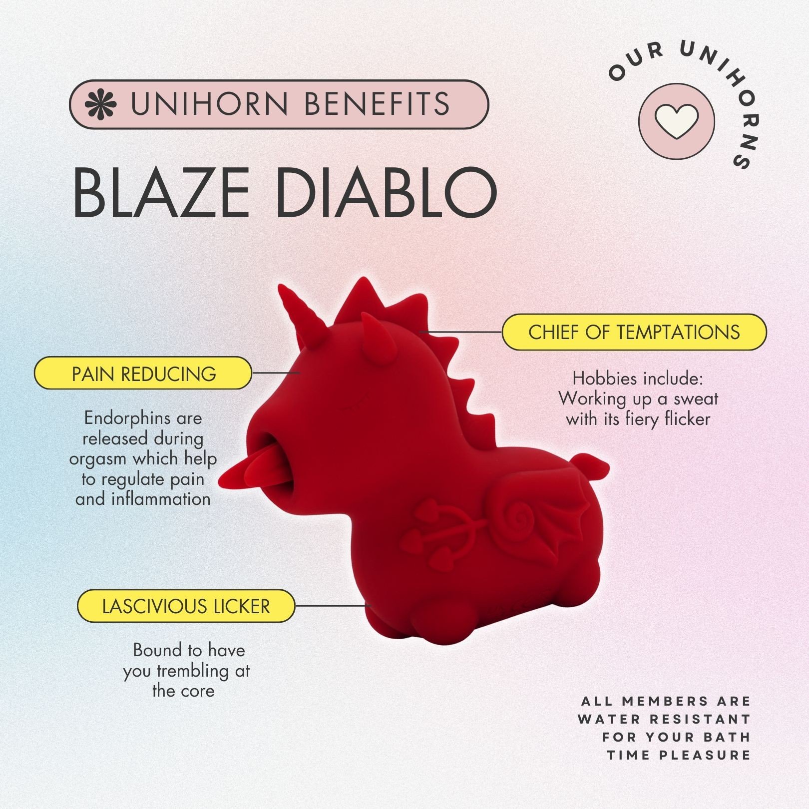 Uspokojte svoje najdivokejšie túžby s mini jednorožcom Blaze Diablo – hriešne zvodným stimulátorom klitorisu, ktorý vás doslova posadne rozkošou.