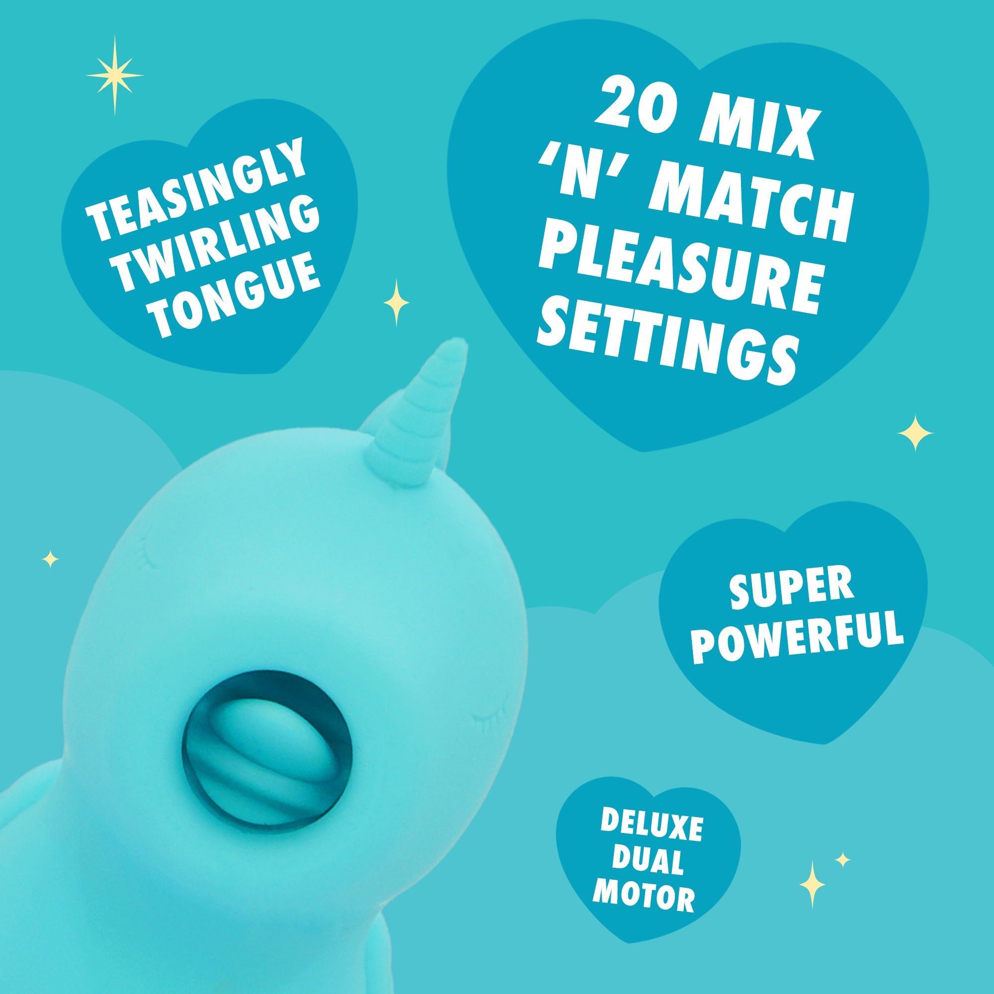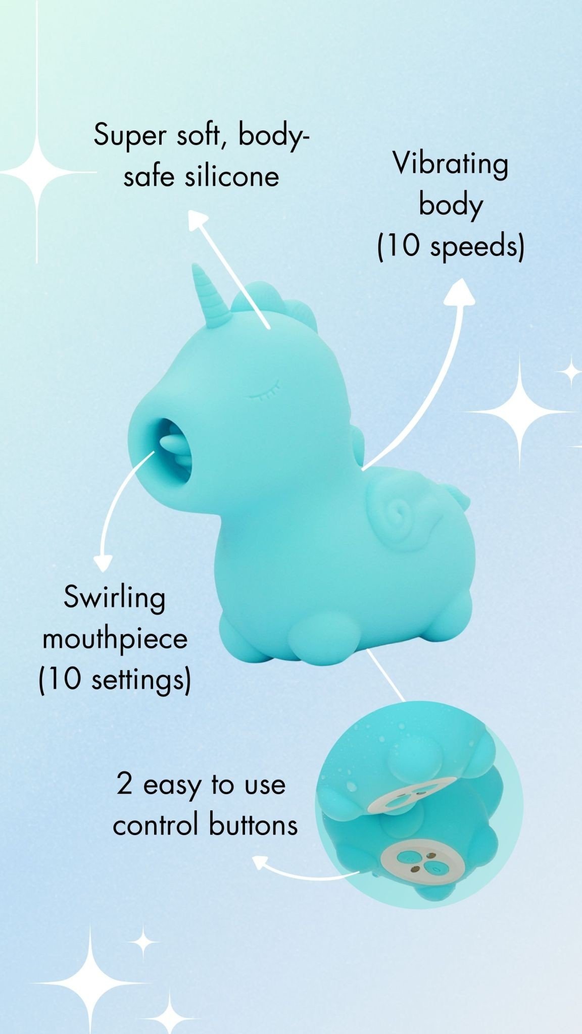 Výkonný stimulátor klitorisu v tvare jednorožca s 10 vibračnými programami a 10 režimami pohybu jazyka, ktoré je možné kombinovať podľa želania. Stimulátor je vyrobený z hebkého silikónu, je vodoodolný a dá sa nabíjať pomocou USB kábla. Viac informácií