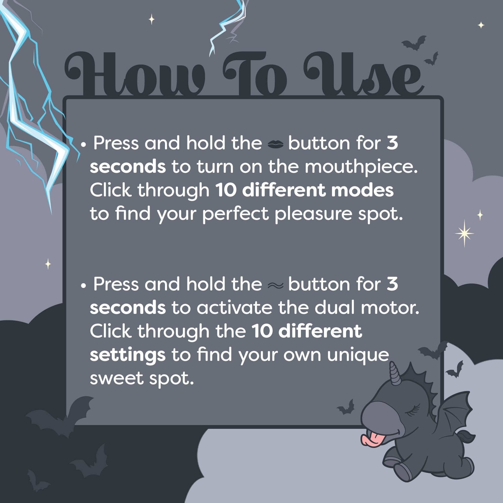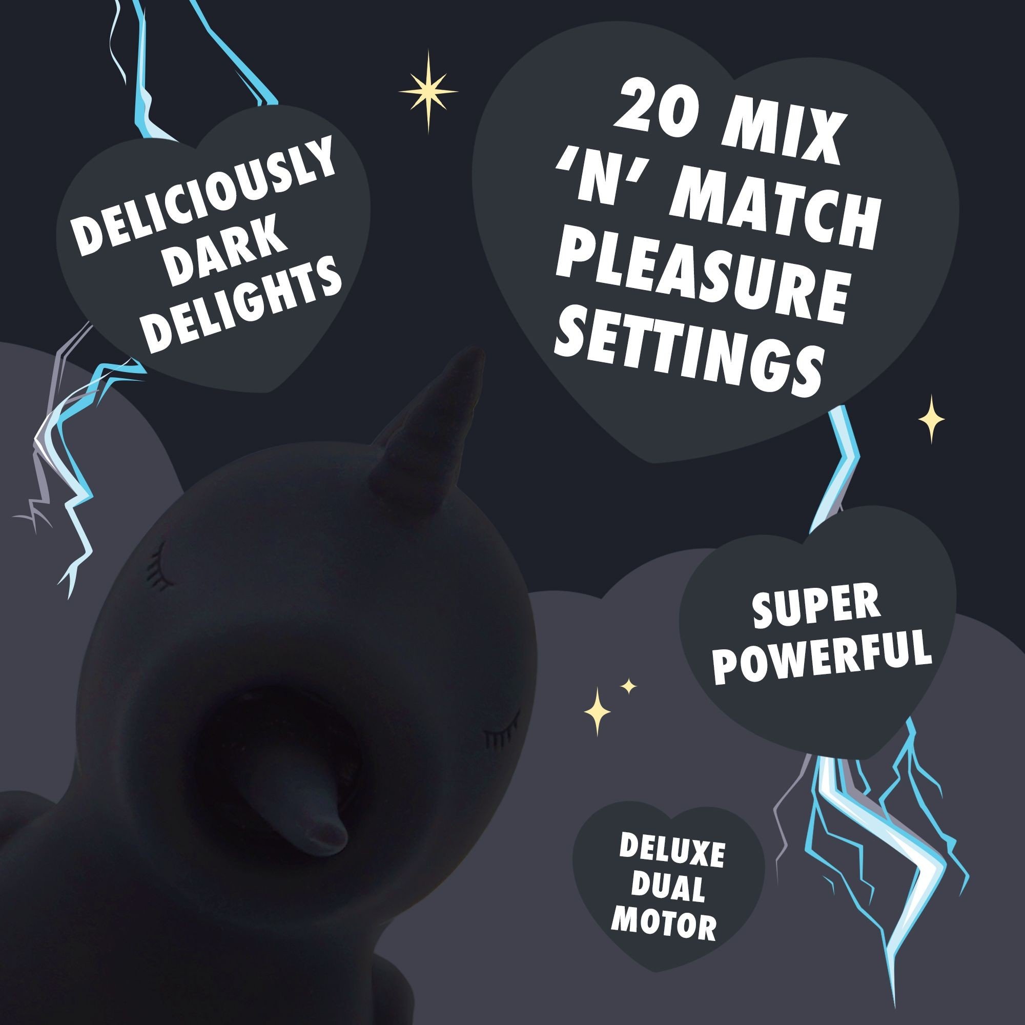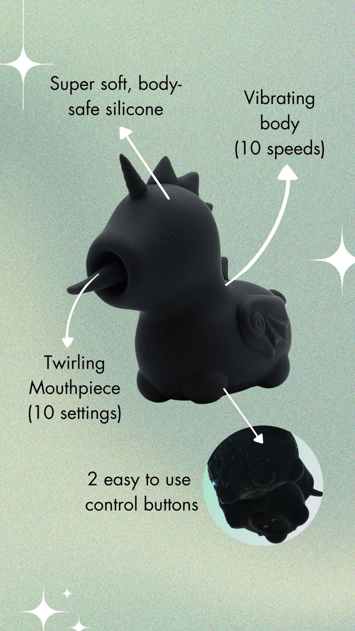 Výkonný stimulátor klitorisu v tvare jednorožca s 10 vibračnými programami a 10 režimami pohybu dlhého jazyka, ktoré je možné kombinovať podľa želania. Stimulátor je vyrobený z hebkého silikónu, je vodoodolný a dá sa nabíjať pomocou USB kábla. Viac informácií