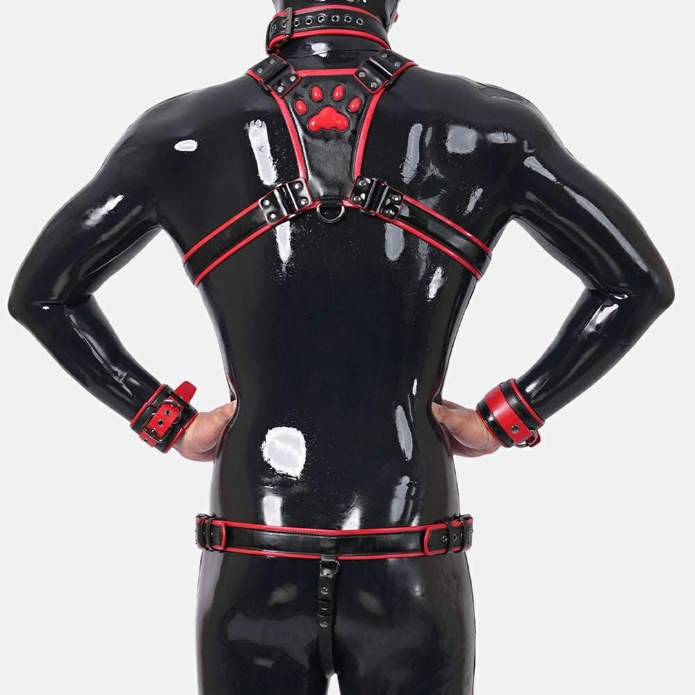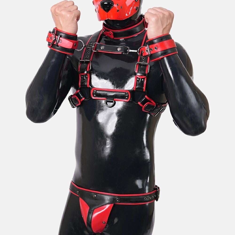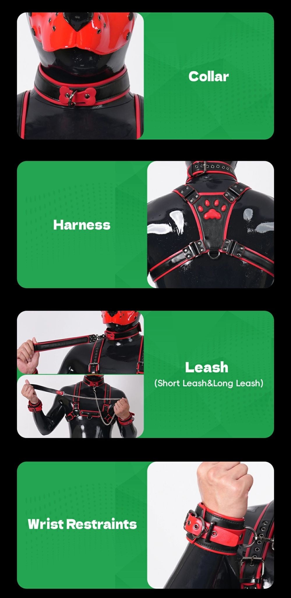 Kompletná sada pre petplay a BDSM z umelej kože v čiernej a červenej farbe. Obsahuje hrudný postroj s motívom psích labiek, rozkrokový postroj, putá, obojok s D-krúžkom a dve vodítka. Všetky časti sú nastaviteľné. Rozmery (približne): obojok 35-50 cm, hrudný postroj 80-120 cm, bedrový postroj 86-110 cm, putá 20-33 cm (šírka 6 cm). Viac informácií